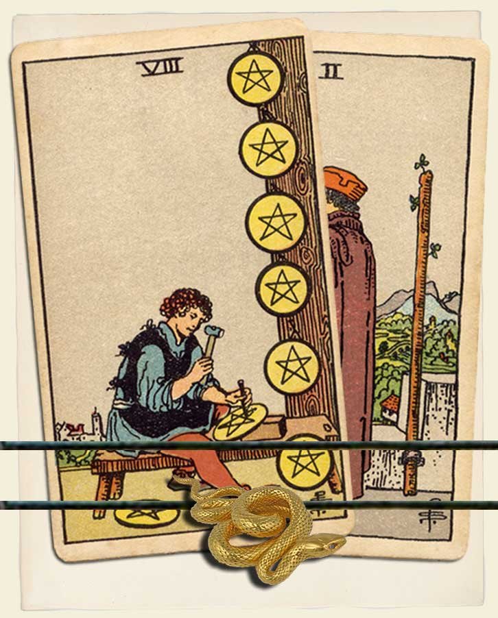 Eight of pentacles and Two of wands combination gives a glimpse into your actual state and close future, which is directed by the guiding influences of (A) Talent and (B) Progress (as clarified by Two of wands). What’s the advice of this pair? The Eight of pentacles is the card of the apprentice. Its presence indicates that it’s time for you to put in some elbow grease and use your talents to create something of tangible value for yourself. Don’t just dive in headfirst, though. The presence of the Two of wands indicates that you will have to think carefully about the progress you want to make and create a strategic plan. Create benchmarks for your progress and keep track of them. If you work hard and set clear goals, you will build something of value.