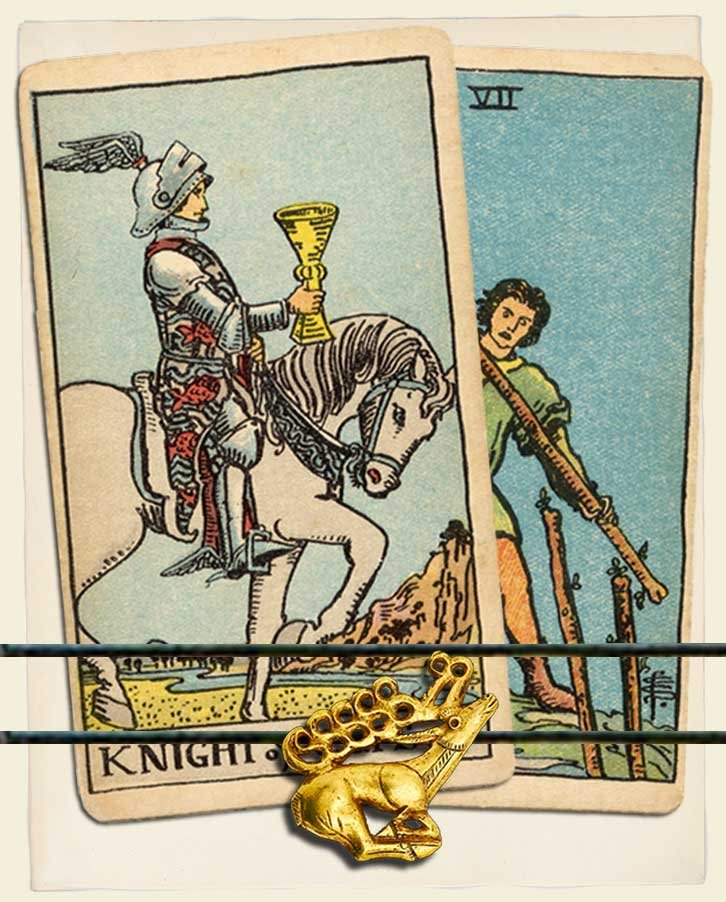 My dear child, the Knight of cups and Seven of wands combination for love and relationships is a sign that you are in a period of change. You are about to embark on a journey where your heart will be tested, but do not fear, for this test will bring you success in love.