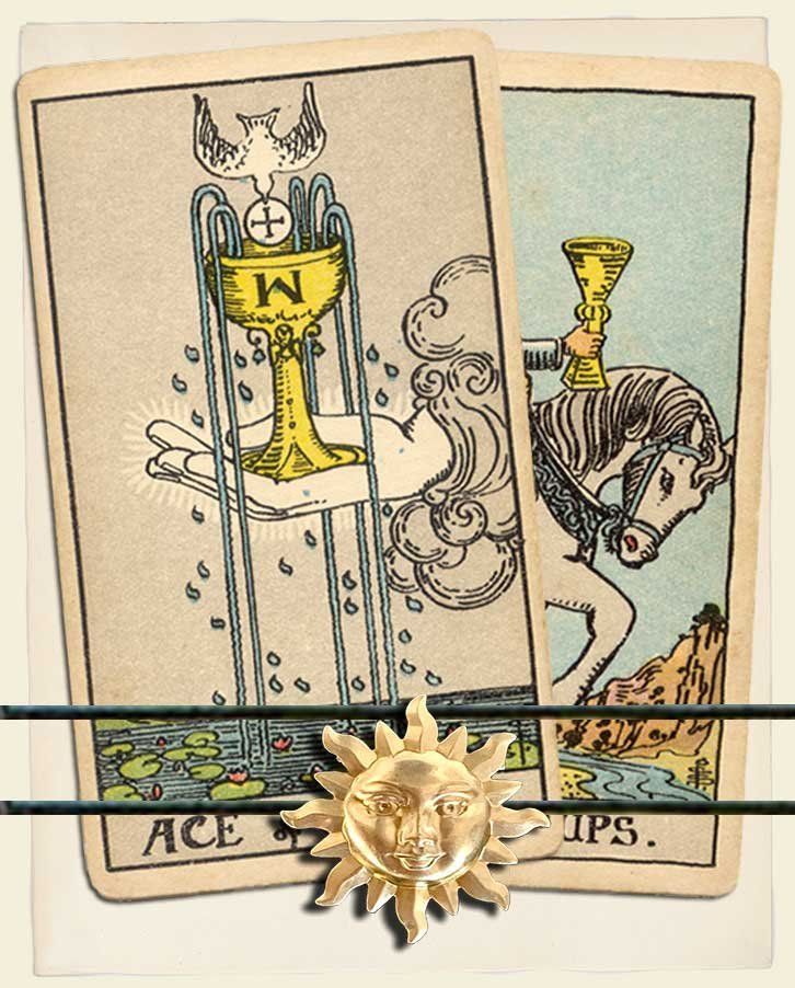 The Ace of cups and Knight of cups combination is a fine sign for love and relationships. When combined, these cards give insight into your medium-term future. The creativity brought by the Ace of cups will be complemented by the graceful energy of the Knight of cups.