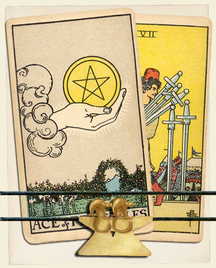 Ace of pentacles and Seven of swords tarot combination is a sign that two mystic forces: 1) New Opportunities (from the side of Ace of pentacles) and 2) Strategy (from the side of Seven of swords) are influencing you at this moment. New opportunities in your work life are glittering on the horizon. This combination encourages you to start laying the foundations towards your career goals. Be strategic and plan for every eventuality to ensure that you are ready for whatever challenges are thrown your way. This will set you apart from competitors and enable you to secure the opportunities you have been dreaming of.