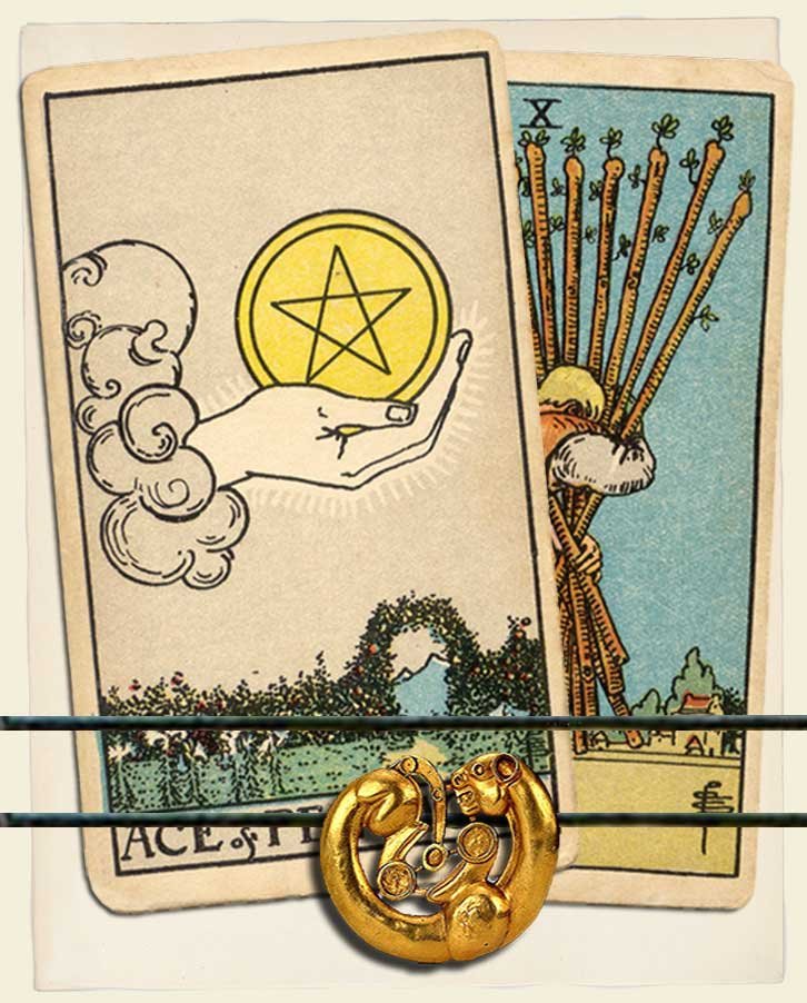 Ace of pentacles and Ten of wands combination gives you a hint about your immediate future. It is influenced by the arcane forces of (A) Security and (B) Burden. The Ace of Pentacles indicates that there is something stable in your life right now, but it also carries an obligation or duty. This may be work, family, or some other responsibility that requires your attention. You’re feeling weighed down under this energy, as if you are carrying too much on your shoulders. The Ten of Wands represents burdensome obligations that often stem from caretaking roles in our families and communities. If these obligations are not being met properly, they will weigh heavily on you for years to come. Take a moment to examine how you can make changes so these responsibilities don’t burden you as much.