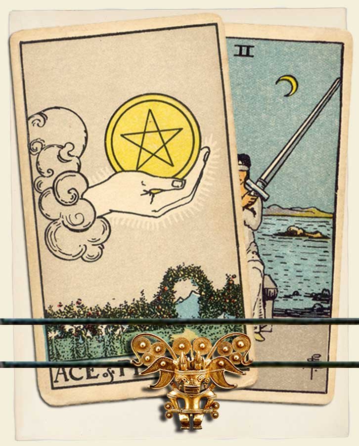 Ace of pentacles and Two of swords combination indicates that two arcane momenta: 1) Stability (Ace of pentacles) and 2) Weighing Up Options (Two of swords) guide your decisions today. How to interpret this tarot combination in practice? At a time like this, it doesn‘t matter how long you have waited or how hard you have worked for it, when money or resources become available, you find that you can‘t get comfortable enough to spend it. Maybe you are having a hard time deciding what you want or maybe you are worried about angering a partner, but the situation becomes uncomfortable. Just put that money aside and save it for a more fun tarot combination. It will happen.