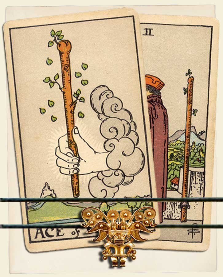 Ace of wands and Two of wands together means that two tarot influences: 1) Inspiration (from the side of Ace of wands) and 2) Decisions (from the side of Two of wands) are affecting you in this card reading. What’s the advice of this pair? The Ace of Wands represents a passionate new beginning that will bring you success. This energy can be overwhelming, though, so it is important to keep things in perspective. The Two of Wands indicates that there is an important decision for you to make soon about how to take advantage of your new opportunities. It may seem like too much work or maybe even something you don’t want anymore, but whatever choice you make will have consequences. Be sure they are decisions you’re prepared to live with long-term.