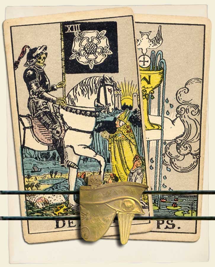 Death and Ace of cups combination indicates that two tarot influences: 1) Letting Go and 2) Intuition have influence on you today. Despite all tactics of avoidance, your gut has spoken, and your gut knows exactly what poison must be removed from your life. We will never win in a battle with our intuition, and you are likely realizing that what it’s asking of you will be challenging. But take the steps that you know you must, and you will find a million pounds lifted off your shoulders. Thank your gut for speaking its truth, rather than continually trying to push it deeper down.