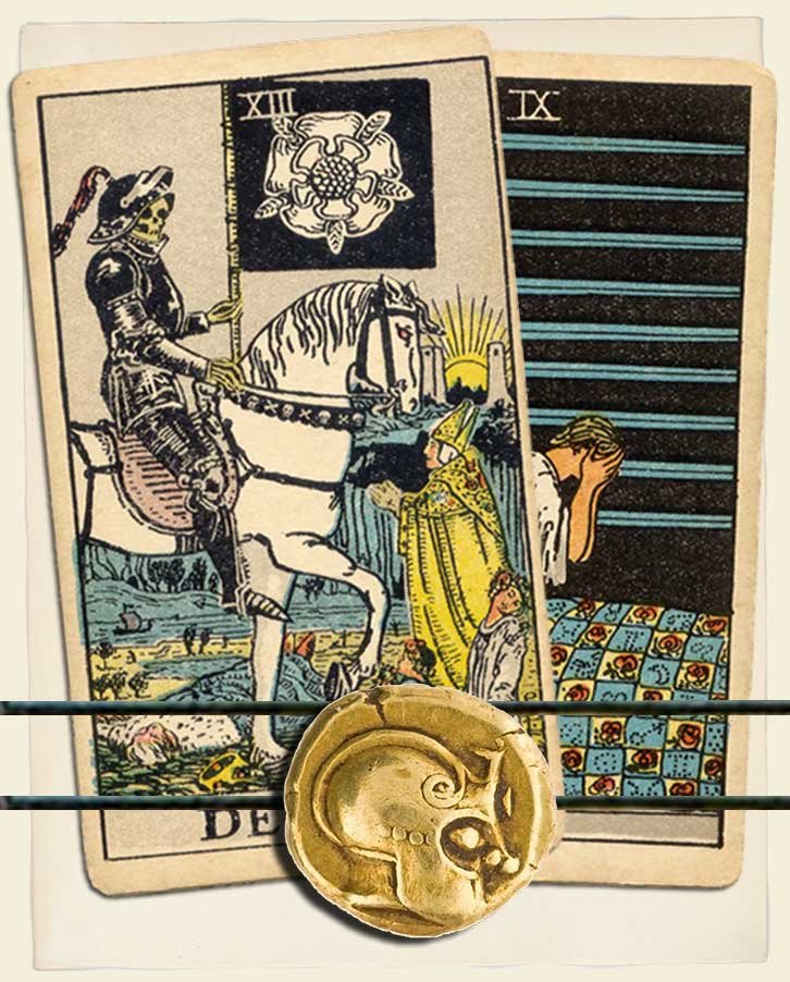 Death and Nine of swords tarot combination indicates that mystic tarot forces: 1) Letting Go and 2) Worry together are exerting influence on you. How to interpret this tarot combination in practice? These cards paired together can look intimidating. No need to fret. It’s just a time for expansion. New beginnings don’t always look like a clean slate. They are usually marked by how you choose to view things. In other words, put down the troubles you cannot control, or you risk going down a difficult path.