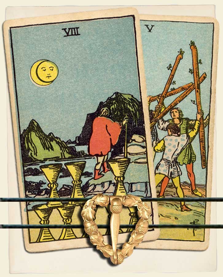 Eight of cups and Five of wands combination is a sign that two mystic forces: A) Abandonment (Eight of cups) and B) Competition (Five of wands) are affecting you today. To put it differently, it means that there is a community or a person not willing to follow behind this person anymore at the time that the pair appears. It usually signifies the feeling or action of a celebration or following of some sort is no longer or is diminishing if you pull this combination. Disillusionment at home could also be indicated when this combination appears.
