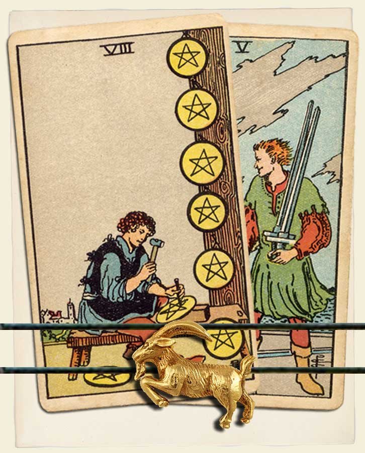 Eight of pentacles and Five of swords tarot combination means that two tarot influences: 1) Skill and 2) Bullying are affecting your life path at this reading. You have the social skills and empathy to mediate difficult situations. Your ability to transform confrontation into calm and productive discussion is an incredibly valuable skill, so remember to use it instead of impulsively leaping to aggressive or defensive reactions in the heat of the moment. Resist the temptation to meet a bully’s anger with more anger. Instead, utilise your empathetic nature and diplomacy to bring about reconciliation.