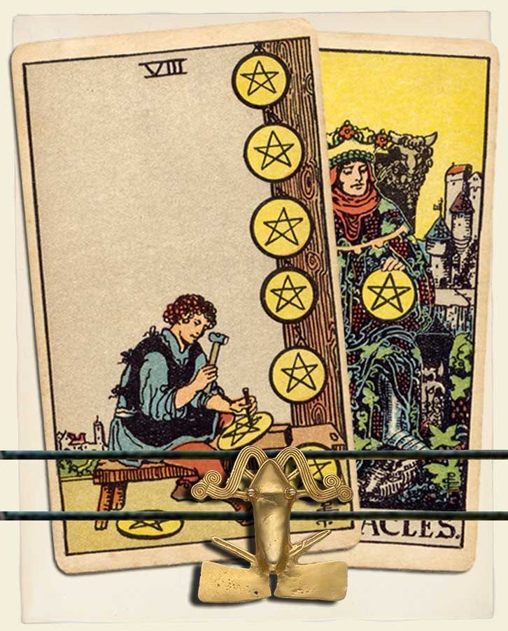 Eight of pentacles and King of pentacles tarot combination gives you a divination about your near future. It is influenced by the arcane forces of MASTERY and ABUNDANCE. What’s the advice of this pair? The Eight of cups represents victory after long hard work. You have learned something, and it has brought you abundance in your life. This may be true for you as well, but if not, don’t worry. The presence of the King of pentacles indicates that whatever this energy brings will be stable and long-lasting wealth (not just instant riches). If you haven’t yet won anything significant in your efforts, take heart that they will pay off eventually with abundance for all involved.