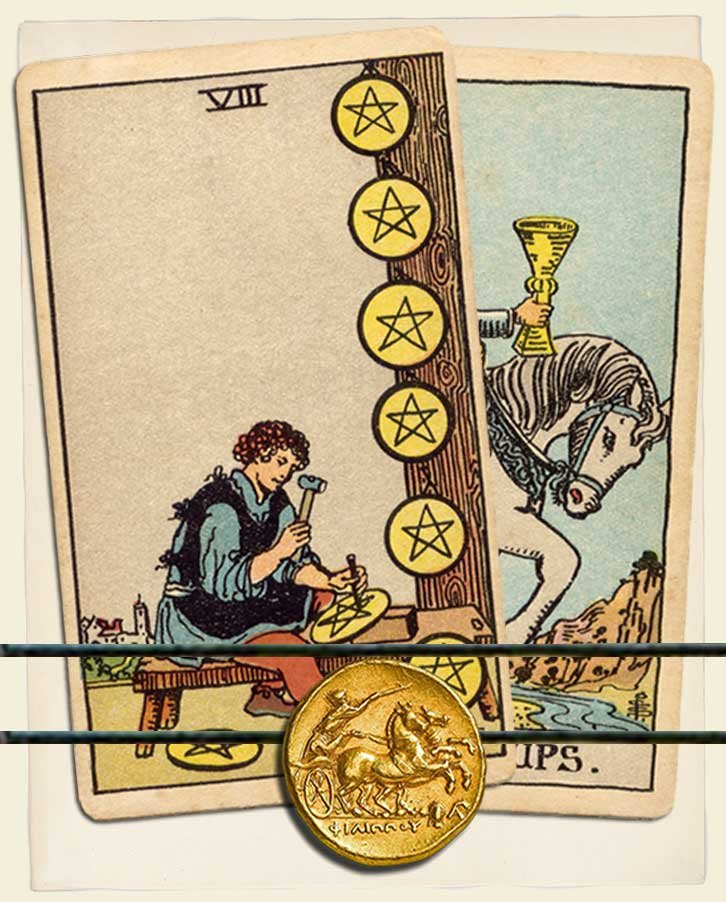 Eight of pentacles and Knight of cups combination gives you a better insight into your current state and immediate future, which is influenced by the tarot forces of (I) APPRENTICESHIP (from Eight of pentacles) and (II) ROMANCE. The love you’ve been waiting for is coming your way, but you’ll have to make some effort. There’s a lesson you need to learn. When you look at the big picture, you miss the details. When you learn to look at the details, you’ll get your wish.