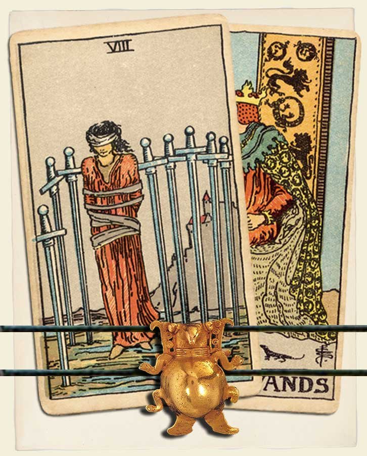 The Eight of Swords and King of Wands combination in love and relationships can be interpreted as a mixed sign. The Eight of swords suggests being stuck in negative thoughts, which may hinder progress towards finding love or reconciling past relationships. On the other hand, the King of Wands brings positive energy to the table with its boldness, passion, and initiative.