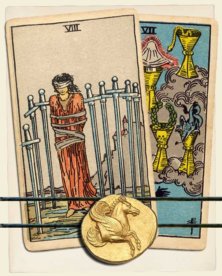 Eight of swords and Seven of cups combination provides an insight into a situation in your future, which is directed by the tarot forces of (A) VICTIM MENTALITY and (B) CHOICES. You have been through a lot. It was hard, but you got through it. Now here comes the good news—you are done with all that nonsense now, right? Wrong. The Eight of Swords indicates that there is something unresolved from this difficult period hanging over your head like a cloud that won’t go away. Perhaps you feel as if you were wronged or perhaps it was just too much to handle at the time, but whatever the reason, this card is advising you to hang on for one more turn around the wheel before giving up on what might be impossible dreams or situations.