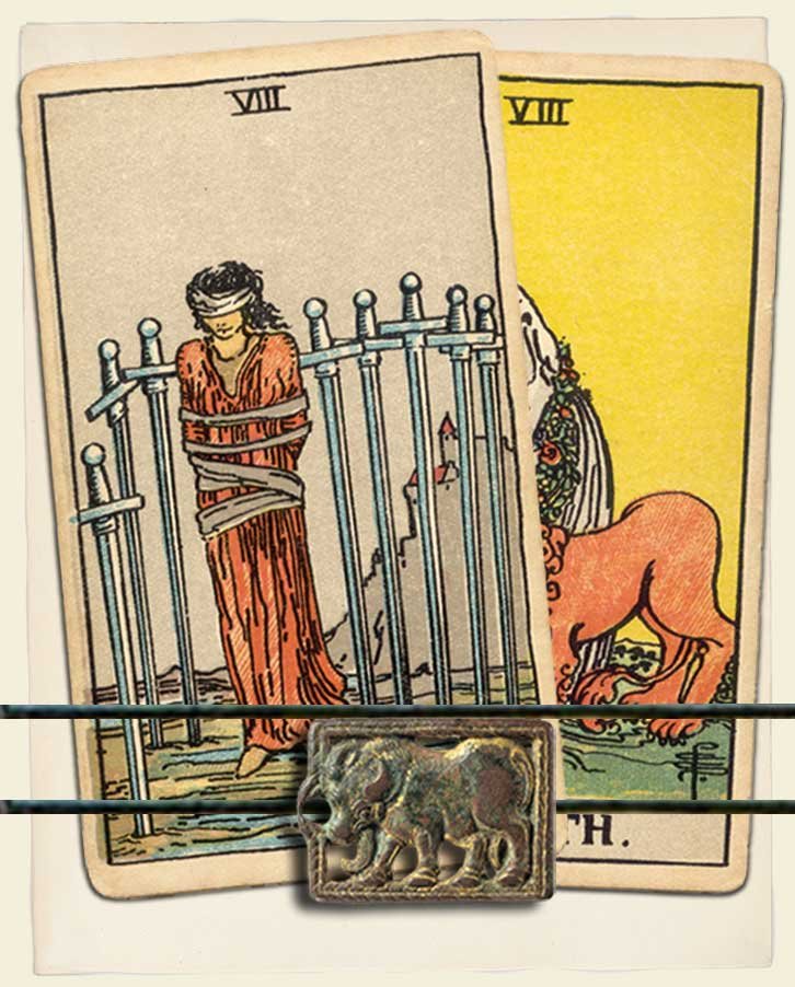 Eight of swords and Strength combination means that arcane tarot forces: 1) restricted and 2) strength guide your decisions today. In essence, you are due to realign how you deal with situations that trap you. Strength comes in many forms, and sometimes we must yield and inch to gain a mile. Pay attention to restrictions that you are straining against, and choose to relax instead, and you may find that the shackles slip straight off.