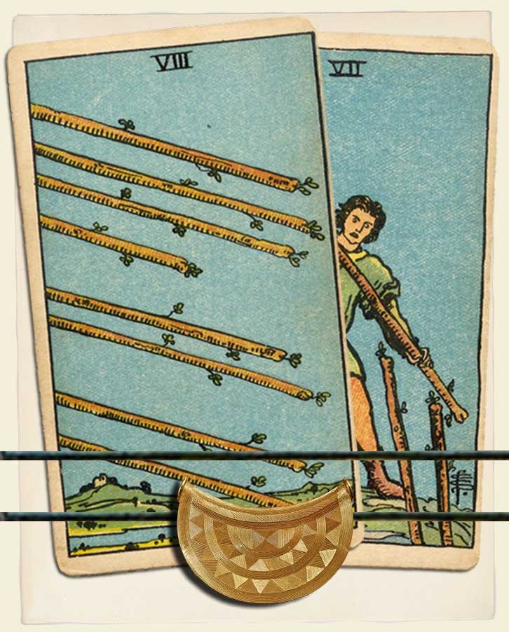 Eight of wands and Seven of wands tarot combination indicates that two tarot influences: 1) Sudden Changes (from the side of Eight of wands) and 2) Challenge (from the side of Seven of wands) are affecting you in this card reading. What’s the advice of this pair? The Eight of wands represent rapid forward movement that can take you by surprise. This card indicates that you should be prepared to react quickly and effectively to sudden changes. The Seven of wands represents having to defend the territory you’ve worked hard to gain. These cards indicate that you may be under quite a bit of pressure, or soon will be. Be firm in your knowledge of what your goals are, so you don’t get sent on a detour.