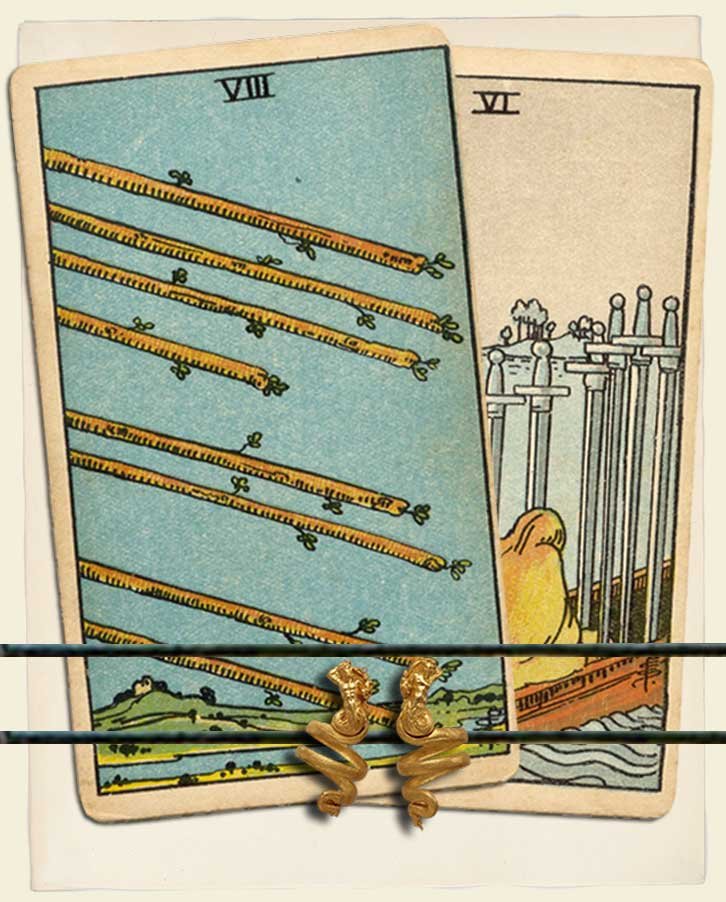 Eight of wands and Six of swords together means that two mystic forces: 1) Alignment and 2) Releasing Baggage are steering you into another direction today. What’s the advice of this pair? The Eight is a card of success brought about by hard work. You have set clear goals, and you’re working diligently to achieve them. This requires an aligned mind, though, so be sure to let go of any limiting beliefs or feelings that might get in the way. The Six represents moving from one place to another quickly and efficiently. It can also represent leaving behind something unpleasant (like a job or relationship). If you need to leave your current situation for whatever reason, now is the time to do it without lingering attachments getting in the way.