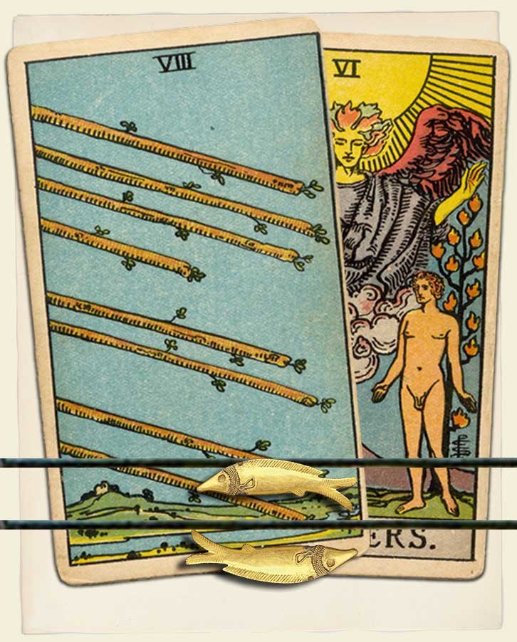 Eight of wands and The Lovers tarot combination indicates that two arcane forces: I) Movement (Eight of wands) and II) Choices (The Lovers) currently guide your decisions. In a nutshell, your current sense of being trapped will soon pass. You’ve been taking on so much lately that you’ve fenced yourself. But these cards suggest hope. Take a few steps back, learn to discern what is essential. Gradually, as you start to remove what you don’t need, the light will start to creep back in. Before you know it, you’ll have the whole world spread out before you again.