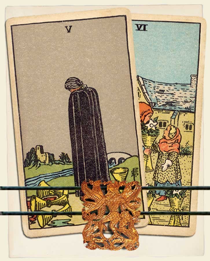 Greetings, young one. You seek wisdom on the meaning of the Five of Cups and Six of Cups combination in matters of love and relationships. Let me tell you, these cards hold great significance.