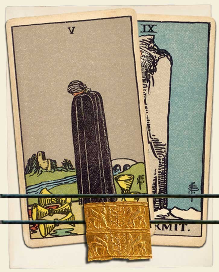 Five of cups and The Hermit combo gives a hint about an event in your future, which is influenced by the arcane forces of (A) Grief and (B) Self-Reflection. You may feel scared to spend time looking inward, in fear of what you’ll discover. Know that while it will be a painful time, it will also be the ultimate time for growth. What we often fear is our own greatness. Time alone will give you space to reconnect to your genuine love of self. Keep some flowers in your home as a reminder of blossoming.