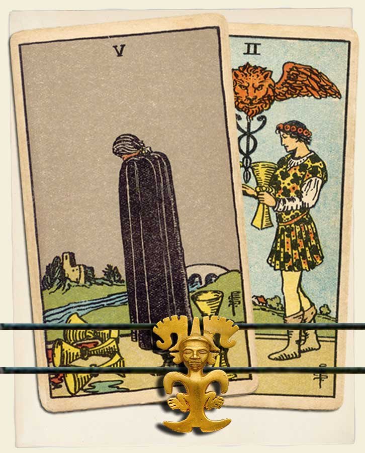 Oh, sweetie! The Five of Cups and Two of Cups together in a love reading can be quite the rollercoaster. On one hand, we have disappointment and regret from past relationships or mistakes. But on the other hand, we have the potential for a new partnership to bring happiness into your life.