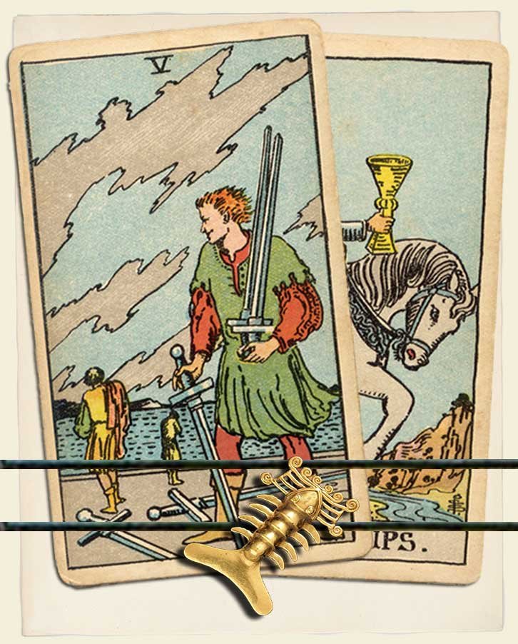 When it comes to love and relationships, the Five of swords and Knight of cups combination presents an undecided sign. The divination reveals that your current state and immediate future are directed by winning at all costs and artistic influences.