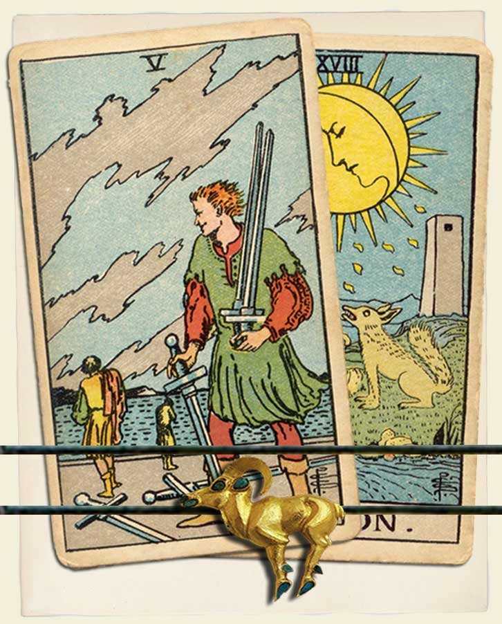Five of swords and The Moon combination gives a clearer perception about an event in your future. It is influenced by the arcane forces of COMPETITION and CONFUSION. I hope you brought your a-game. A friendly rivalry may be on its way if you pay attention to the details. Through work, sports, or school, you are deemed healthy competition. Try not to question the what and why, focus on the when and where. This is a trust exercise for your intuition. When the fog lifts, all the pieces will fit together.
