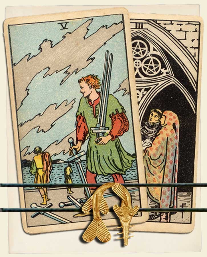 My dear child, the Five of Swords and Three of Pentacles combination is a troubling sign for love and relationships. The energies that guide this combination are “Winning at all costs” and “Learning.” This means that your future will be filled with defeat if you do not learn to collaborate with those around you.