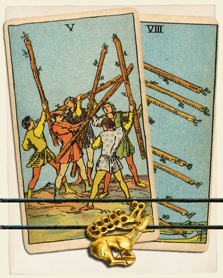 The combination of Five of wands and Eight of wands is not a good sign for love and relationships. These cards indicate that there are conflicts in the relationship, which will soon boil over completely. The guiding influences here are Conflict and Sudden Changes, which means that things may get worse before they get better.