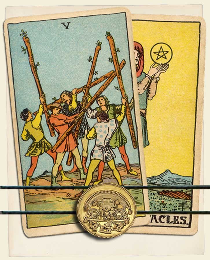 Five of wands and Page of pentacles combination provides an insight into your actual state and close future, which will come to pass from the combined effect of (1) Competition (effect of Five of wands) and (2) Skill Development (effect of Page of pentacles). Your current frame of mind has become overly concerned with trying to outshine other people who share your skills. This competitiveness will only nurture bitterness and jealousy, and you will soon lose sight of why you decided to develop your skills in the first place. The only person you should compete with is your past self, focus less on overtaking others, and more on trying to beat your personal best score.