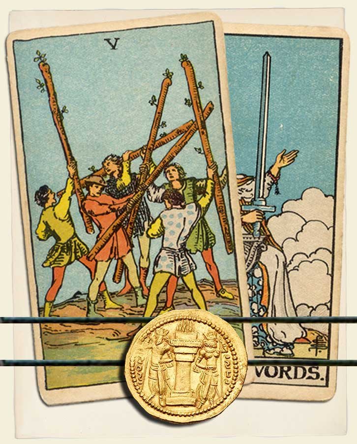 Five of wands and Queen of swords tarot combination means that two tarot influences: 1) Aggression (Five of wands) and 2) Honest (Queen of swords) are exerting their influence on your life’s choices. These cards tell you that there is a time and a place for brutal honesty, and this is it. You won’t get through to someone by mincing your words now. The time for hedging and dropping hints has passed, and now you need to speak your truth frankly and directly. You may hurt some feelings and cause some dispute in the process, but hold your ground.