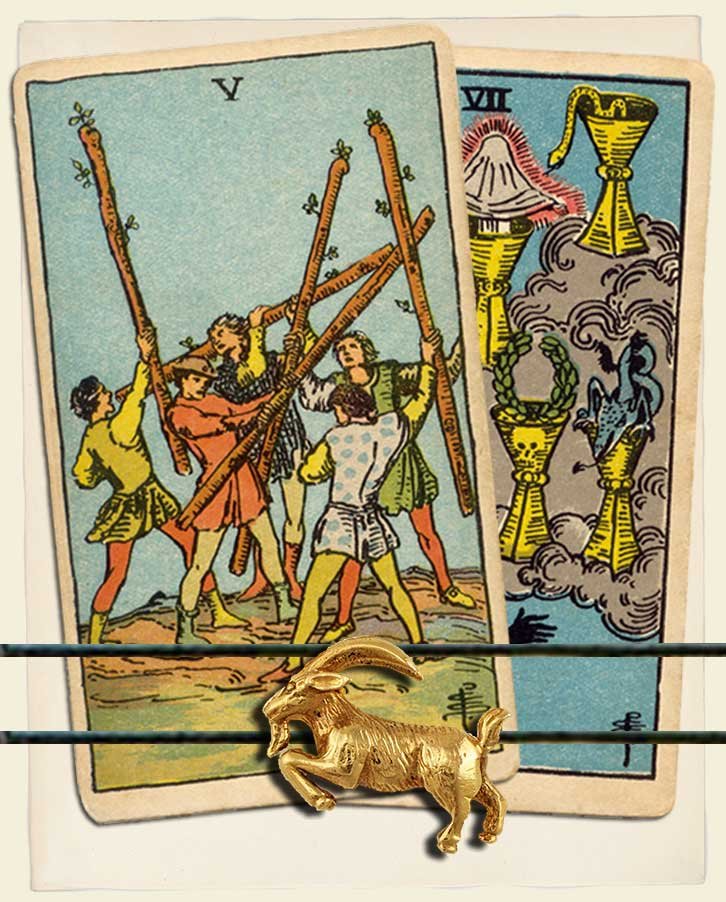 Five of wands and Seven of cups tarot combination gives a glimpse into an event in your future, which will arise from the combined effect of: (I) TENSION (effect of Five of wands) and (II) OPPORTUNITIES (effect of Seven of cups). It tells you that that there might be conflicts and disagreements in your family, workspace, or relationships, but that these conflicts are really blessings in disguise. Because with conflict comes opportunity, and the chance to see things from a new perspective. To learn to grow. It might not seem so at first and the tension that may arise might lead you to want to hide and pretend it’s not there. But with active listening, curiosity, and empathy, you will find that any conflict can act as a doorway into deeper understanding and intimacy between you and the other person. Conflict can also be presented as an opportunity for you to discover where your own boundaries lie, how to communicate them clearly and how to implement them.