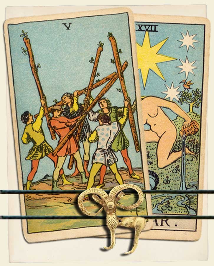 Five of wands and The Star combination is an omen that tarot influences: 1) Competition (from the side of Five of wands) and 2) Positivity (from the side of The Star) are influencing you at the moment. What’s the advice of this pair? The Five of wands indicates that there is conflict or competition affecting your life, right now. This energy isn’t very strong, but it can be quite distracting, so be sure to keep things in perspective and nip matters in the bud. The Star represents remaining hopeful during difficult times. Stay positive, and don’t allow the negativity to overwhelm you. Keep moving forward, and this will all fall by the wayside.