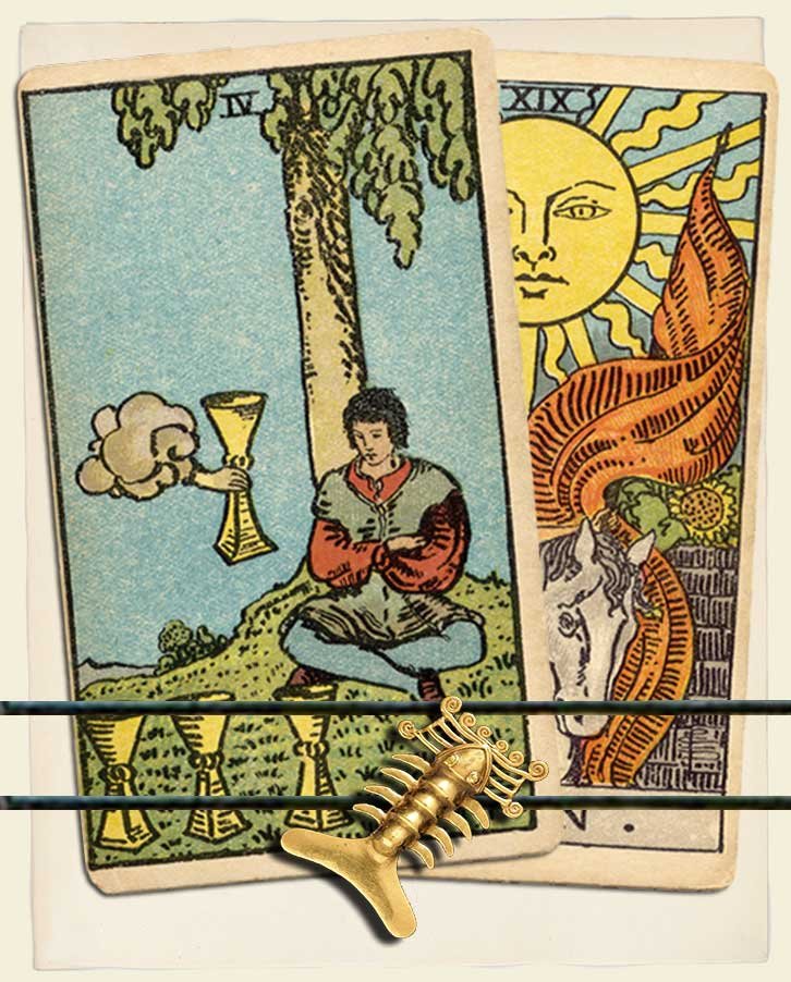 Ah, the Four of cups and The Sun combination in love and relationships. It is neither good nor bad, my dear. This tarot card pairing provides an insight into your current state and close future – influenced by the arcane tarot forces of Melancholy and Success.