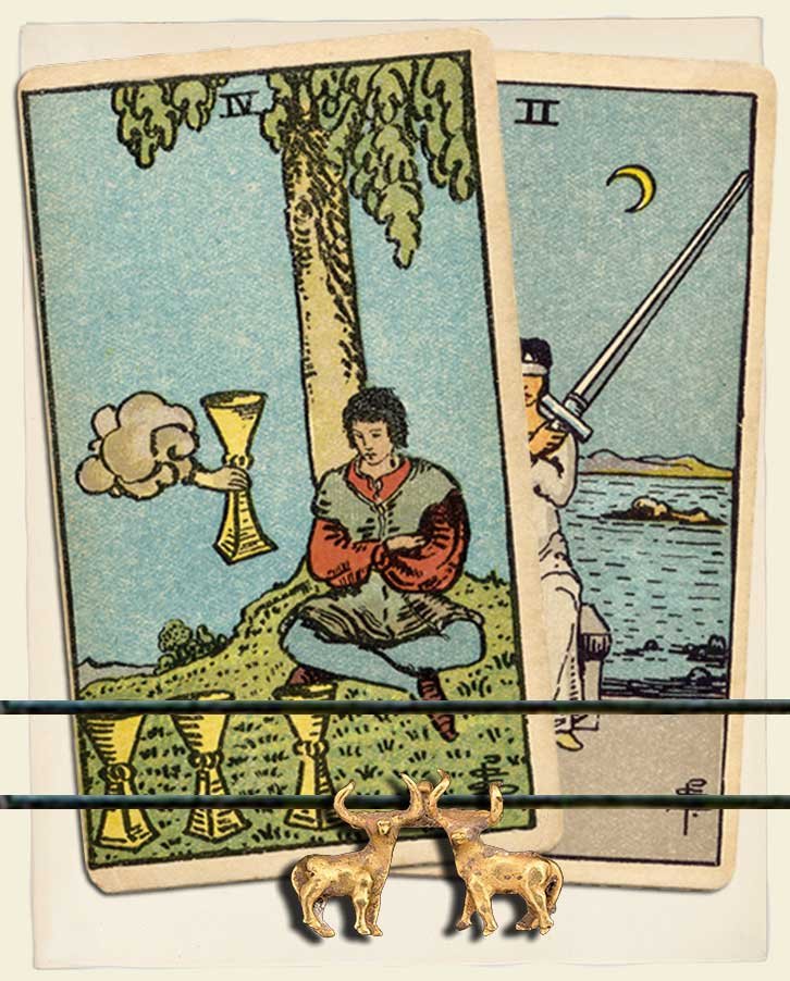 Four of cups and Two of swords tarot combination gives an insight into a major event in your future, which will come to pass from the combined effect of (1) REEVALUATION (effect of Four of cups) and (2) DIFFICULT DECISIONS (effect of Two of swords). To put it differently, it means that you are on the verge of a decision. Before you make a decision, you must assess the situation from all sides. You have to think about the possible consequences and choose the least damaging thing for later. If I need guidance, I suggest you look at what is in your heart. Let your heart be your guide.
