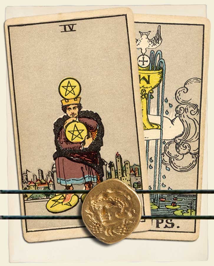 Four of pentacles and Ace of cups tarot combination means that tarot influences: (1) Conservatism (Four of pentacles) and (2) Spirituality (influence of Ace of cups) govern your life decisions today. In other words, it gives you a sign that suddenly everything has gone wrong in love. Something happens that you thought would never happen. You can’t take a step back because of your pride. Your 2nd card is the ace of cups and shows that everything will suddenly be all right, you will keep your heart at ease, put your pride aside and do what comes from within.