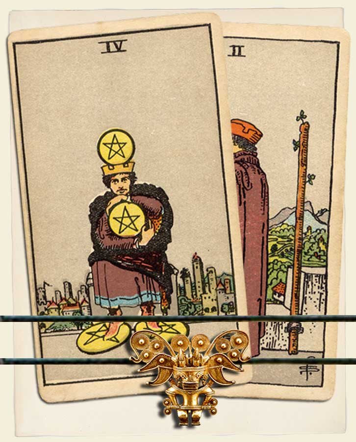 Four of pentacles and Two of wands combination indicates that two arcane forces: A) Insecurity (Four of pentacles) and B) Future Planning (Two of wands) are affecting you in this card reading. Think of it this way: thus far, you’ve made your way through life like a master cartographer. Look at all the places you’ve visited! And all without ever having to leave the comfort of your studio. Well, you know what they say about the map and territory? Think of it this way: You have far less to be afraid of than you think. In fact, your reluctance to venture out and put yourself at risk is far more dangerous than anything you could encounter out there.
