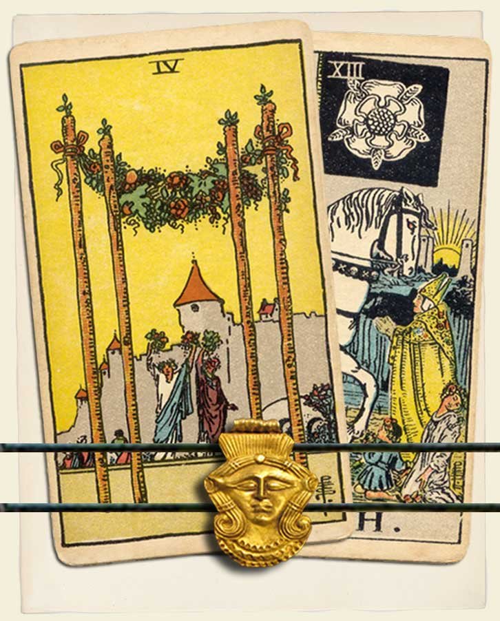 Four of wands and Death tarot combination gives an insight into your distant and barely discernible future. It is influenced by the arcane forces of (1) PARTIES and (2) TRANSFORMATION that will affect you in a profound way. You are about to undergo major changes, but don’t worry. This won’t be all bad or scary for too long. The Four of Wands indicates that there will be some fun involved here as well, so take heart even if it seems like everything around you is falling apart at once. New opportunities await you, and they come with new friends who can help guide you through this transition successfully.