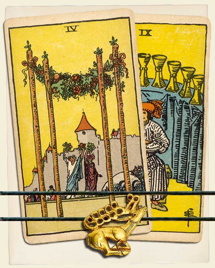My dear friend, the Four of Wands and Nine of Cups combination is truly a wonderful sign for love and relationships. I believe that these cards bring two important influences into your life: community and satisfaction. It is an omen that you will soon find peace in your relationship.