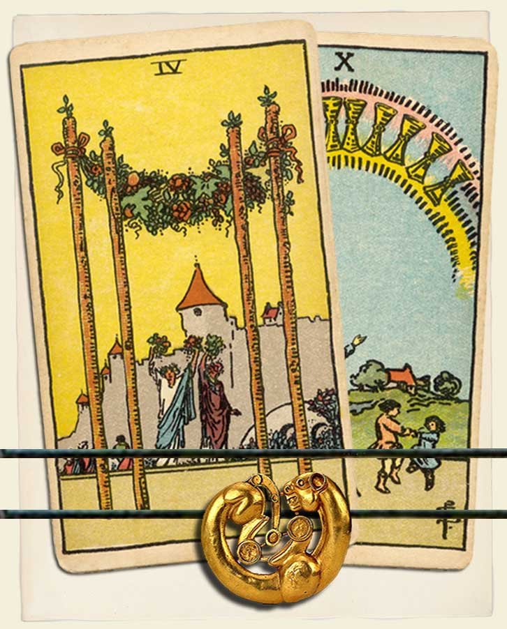 Oh, my dears, the Four of Wands and Ten of Cups together is a truly wonderful sign for love and relationships! This combination brings two powerful forces into your life: reunions and blissful relationships. It’s like the universe is nudging you towards someone special.