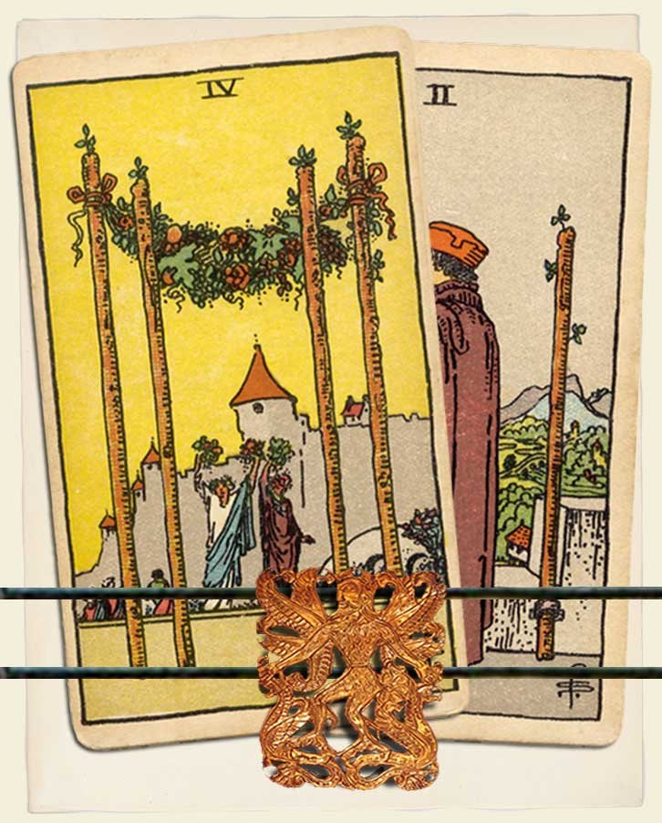 The Four of Wands encourages relaxation and taking a break from trying to account for every possible outcome. It reminds us that sometimes getting lost is necessary to really start living. Meanwhile, the Two of Wands urges us to plan carefully for our future goals while staying true to ourselves.