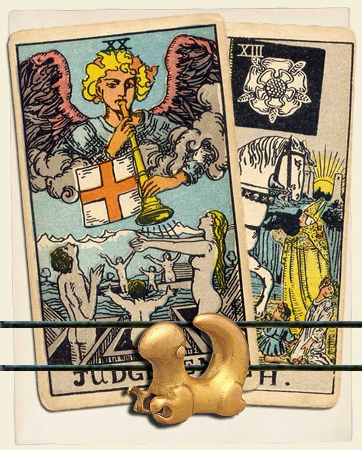 Judgement and Death combination gives a clearer perception about an outcome in your future. It is influenced by the tarot forces of (I) RENEWAL (from Judgement) and (II) TRANSFORMATION. As with all cycles, people and memories from your past may present themselves soon in a new way. Be open to their changes in this stage of your life. Time has the power to heal wounds, and your relationship may now be able to flourish with acceptance of the past and united goals for the future. Has holding that grudge been serving you? Or can you find it in your heart to move on? Look for opportunities of renewal in your life at this time to prepare you for what’s to come.