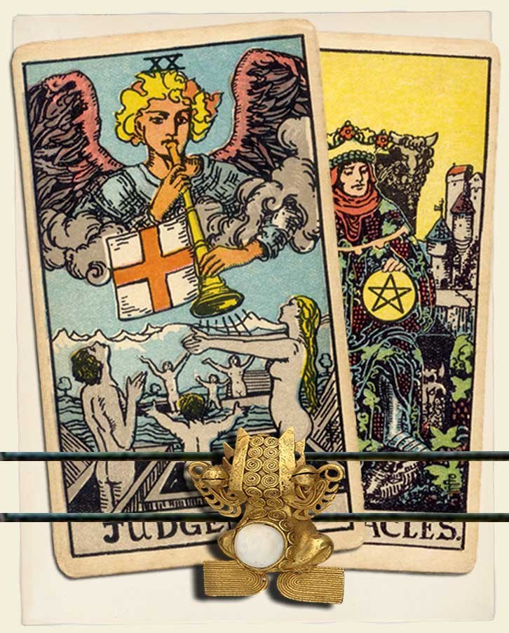 Judgement and King of pentacles together gives a hint about an outcome in your future, which is influenced by the arcane tarot forces of (A) INNER CALLING and (B) DISCIPLINE. A reading like this implies you will soon find your way. Up until now, you’ve been like a woman trapped in a cave searching desperately for a way out. It’s claustrophobic in there, and there have been times when you’ve felt yourself giving into panic too. Still, you’ve kept your cool, and now the light is beginning peek through. Soon, these cards imply, you will be in the clear: You will find your way back into the world.