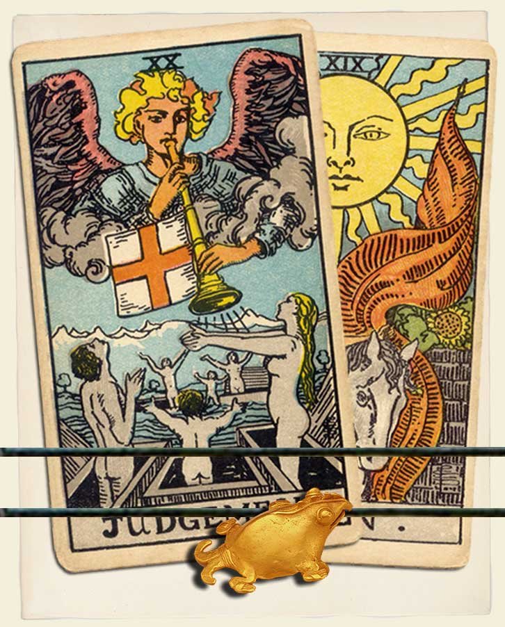 Judgement and The Sun tarot combination gives you an insight into your medium-term future. It will arise from the combined effect of: (I) REBIRTH (effect of Judgement) and (II) FUN (arcane effect of The Sun). You have been waiting for this moment, and now it is here. Whatever you were afraid to do before has finally come to pass, so take heart. Your fears are behind you now as a new beginning begins that brings with it much joy. There is something special about what you are doing right now that makes every day worth getting out of bed for, but be careful not to get carried away. Enjoy yourself, but don’t burn any bridges along the way.