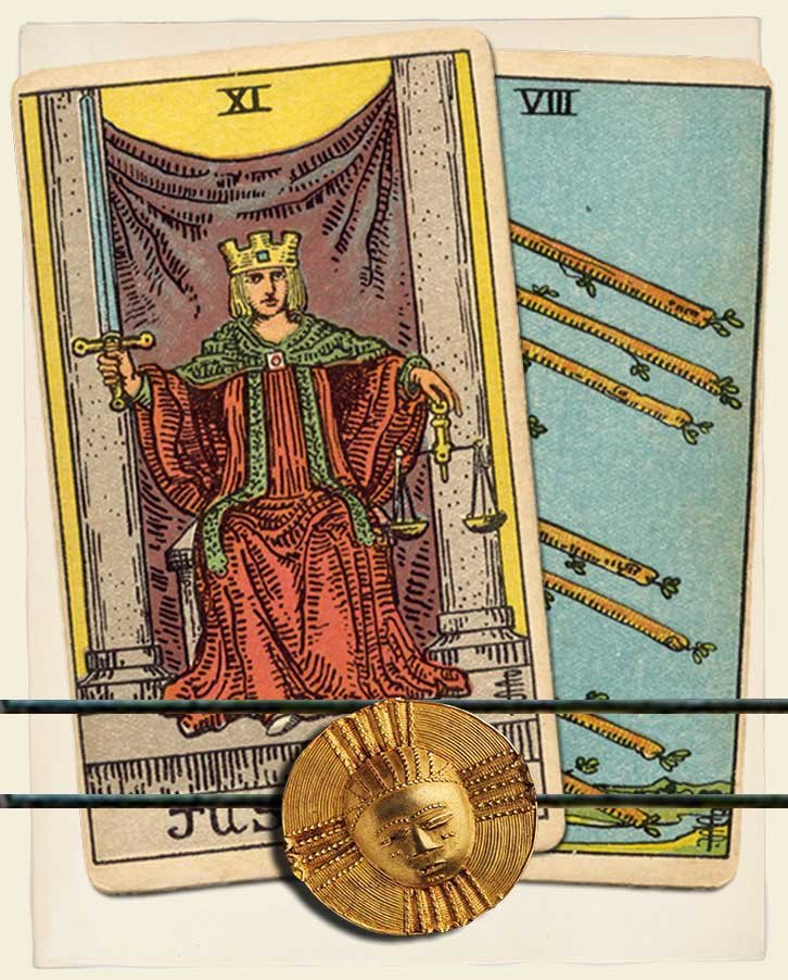 Justice and Eight of wands combination gives you intuition about a major event in your future, which is directed by the guiding influences of (1) JUSTICE and (2) FAST PACED CHANGE (effect of Eight of wands). Karma is the universal law of equilibrium, the ebbs and flows of energy coming back to the source that generated it, sometimes the journey takes long, some other times it’s just a matter of seconds: in your case, get ready because all the pieces of the puzzle are falling into place very quickly, debts will be paid, the scale are going to be balanced, and this in turn will bring a chain reaction of events leading to new equilibriums.