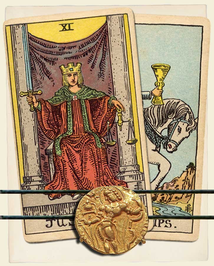 Justice and Knight of cups combination means that two mystic forces: I) Accountability (Justice) and II) Artistic (Knight of cups) have influence on you today. What’s the advice of this pair? The presence of Justice indicates that there is a wrong that needs to be righted. Something unfair has happened, and it is up to you to hold yourself accountable for making things right. The presence of the King card indicates that your artistic side will help bring out your inner ruler. This king doesn’t just rule with an iron fist, he rules wisely, so his subjects are happy and thriving as well. Use your creative juices to find justice in situations where others may not see it the same way.