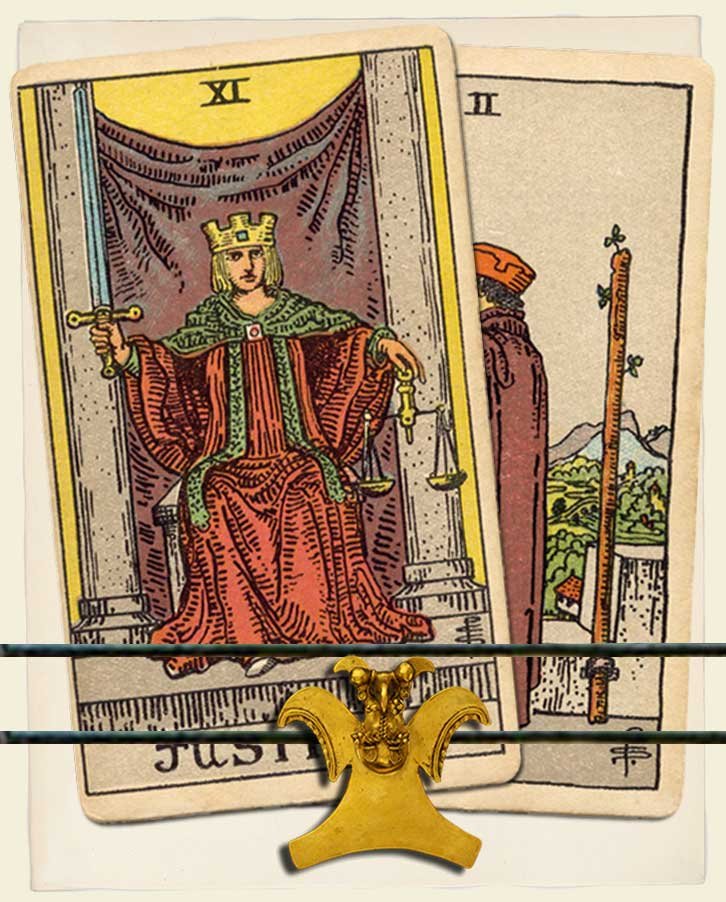 Justice and Two of wands combination gives you a hint about your immediate future, which is influenced by the tarot forces of (I) Karma (from Justice) and (II) First Steps. What does it mean in practice? This reading implies that you will soon have to make a move. After all, you’ve been avoiding it for what seems like an age now– and the longer your inaction continues, the harder it becomes. These cards should give you hope, however: if you are pure of heart, your decision won’t lead you astray. After all, like the Buddha said, as the wheel follows the ox that draws the cart, we act as we think.