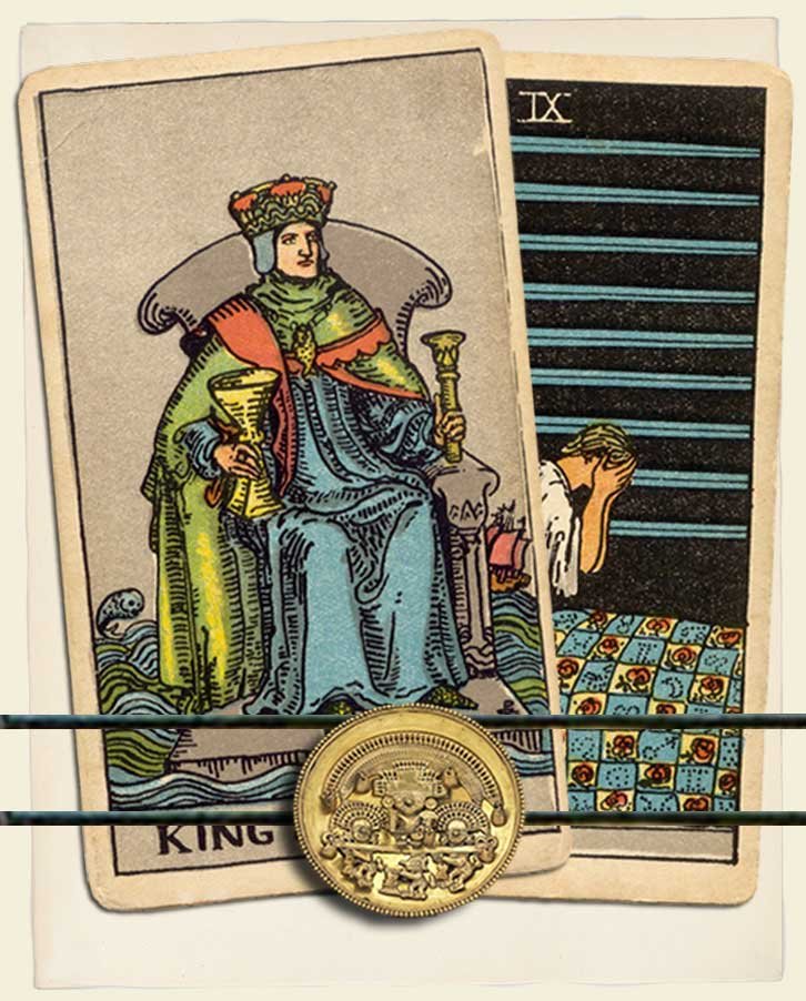King of cups and Nine of swords combo means that two forces: 1) Compassionate (from the side of King of cups) and 2) Depression (from the side of Nine of swords) are affecting you in this card reading. To put it differently, it’s important to remember that you cannot help everyone, no matter how compassionate you might be. You must also take a step back and focus on taking care of yourself, or you will be the one who ends up feeling overwhelmed and depressed. It is important to find a balance between helping others and taking care of yourself. Reach out if you need to, and remember to breathe.