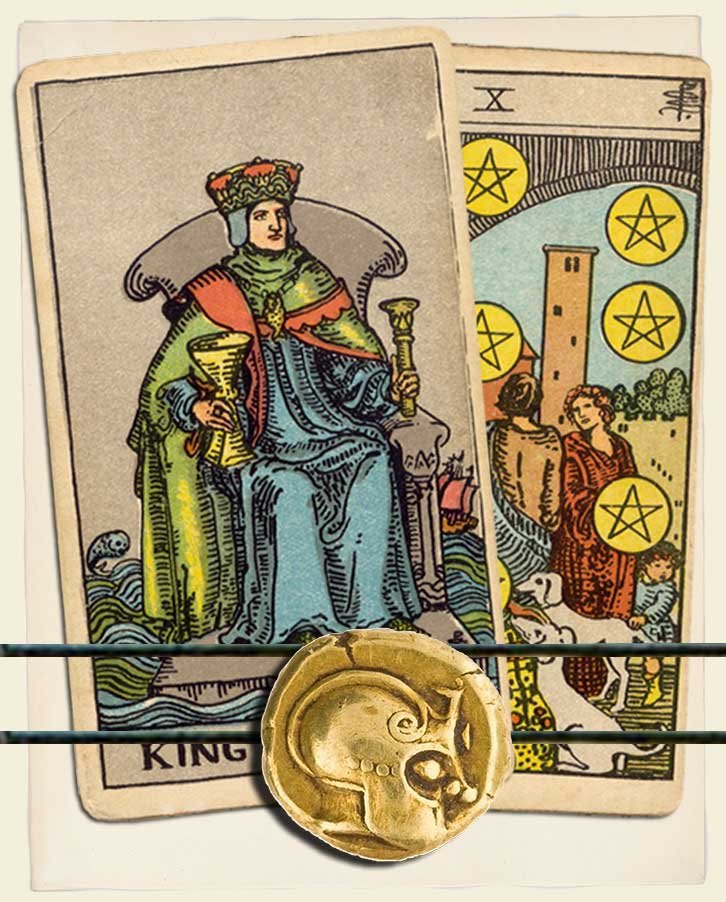 Well, well, well. The King of Cups and the Ten of Pentacles together? Now that’s a fabulous sign for love and relationships, my friends. This combination gives you insight into a significant event in your future – one that will come to pass from the combined effect of balance between head and heart (thanks to the King of cups) and inheritance (courtesy of our friend, the Ten of pentacles).