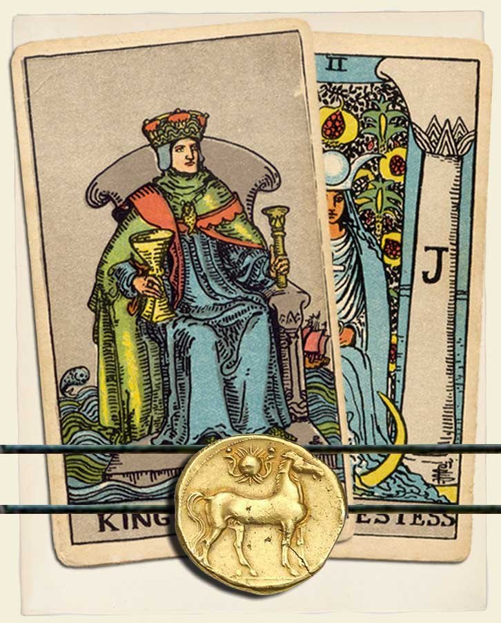 As a wise tarot reader, I would interpret the combination of King of cups and The High Priestess as an indication towards your near future in love and relationships. These cards suggest that you may have hit a roadblock on your journey to find love or maintain a healthy relationship. It is time for you to take a break and focus on self-care.