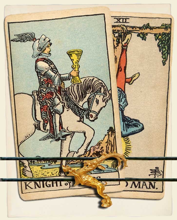 Knight of cups and The Hanged Man combination gives you a better insight into an event in your future, which will come about from the influences of (1) CHARM (effect of Knight of cups) and (2) PAUSE (effect of The Hanged Man). You feel that you are a magnet for luck. The universe is working so hard for you that you feel like you are the only one in the world. It is only a matter of time before you meet the person of your dreams. Keep your eyes open and realize when that moment comes.