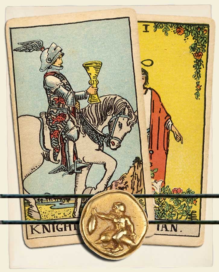 Knight of cups and The Magician combination gives a glimpse into your prevailing state and close future, which will arise from the combined effect of: (I) ROMANCE (arcane effect of Knight of cups) and (II) CONCENTRATION (effect of The Magician). You are ready to tap into your most authentic self to attract your dream partner. Use your charm now more than ever to unlock great love in your life. Be cautious not to do this with deceit, but rather with a pure heart. Follow your intuition and open your eyes to all those who have been right in front of you the whole time. It’s possible your perfect mate has been there and you’ve been blind. Curiosity will help you find the light.