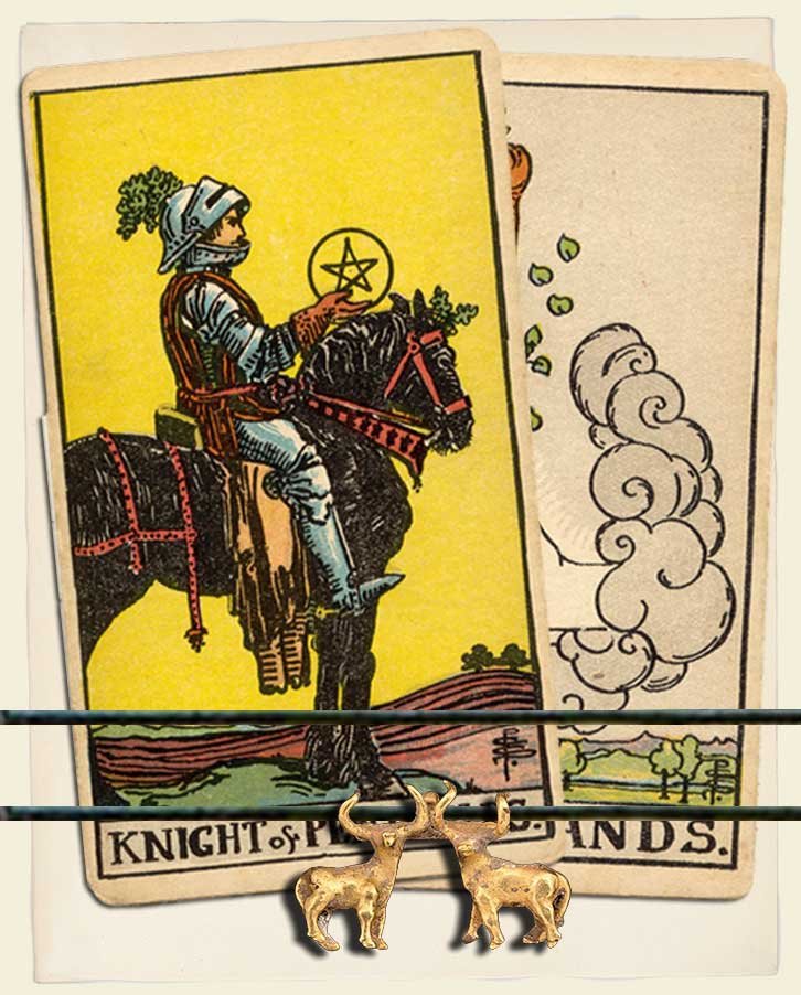 Knight of pentacles and Ace of wands combination indicates that mystic tarot forces: 1) STOIC (influence of Knight of pentacles) and 2) ENERGY (influence of Ace of wands) govern your life perception today. What does it mean in practice? It means that practice is what you are good at when this Knight walks hand in hand with the Ace of Wands. This is where you find your mojo today. There is great power in putting the pieces together, in building that puzzle that once seemed too complicated. Fit a piece here. Jostle another in the corner there. You are bound to figure out where everything goes eventually, but the word “eventually “does mean that it will take time. Roll with it. You are getting there.